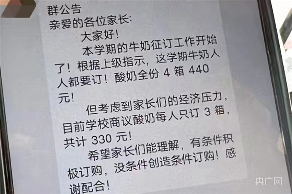 ·駐馬店正陽縣教育局發(fā)布關(guān)于正陽縣某學(xué)校涉嫌違規(guī)征訂學(xué)生飲用奶的調(diào)查情況通報(bào):涉事班級解讀文件出現(xiàn)偏差。處理意見:立即暫停征訂工作,進(jìn)行整頓規(guī)范,對相關(guān)責(zé)任人員進(jìn)行調(diào)查。