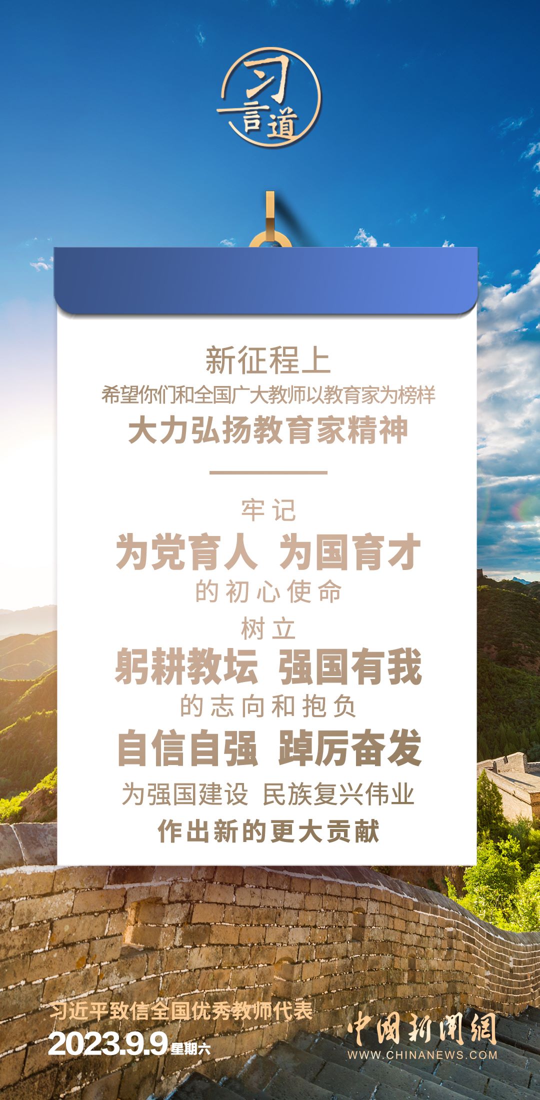 全國(guó)優(yōu)秀教師代表座談會(huì)9月9日在京召開(kāi)。中共中央總書(shū)記、國(guó)家主席、中央軍委主席習(xí)近平致信與會(huì)教師代表,在第三十九個(gè)教師節(jié)到來(lái)之際,代表黨中央,向他們和全國(guó)廣大教師及教育工作者致以節(jié)日的問(wèn)候和誠(chéng)摯的祝福。習(xí)近平指出——