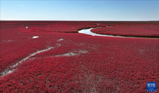 近日,遼寧省盤錦紅海灘國家風景廊道內的堿蓬草迎來最佳觀賞期,吸引了眾多游客前來觀賞游玩。