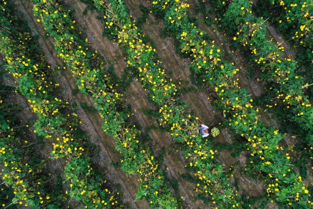 ↑2023年9月11日,湖南省常德市澧縣官垸鎮(zhèn)常發(fā)村,農(nóng)民在采摘絲瓜。CICPHOTO/柏依樸 攝