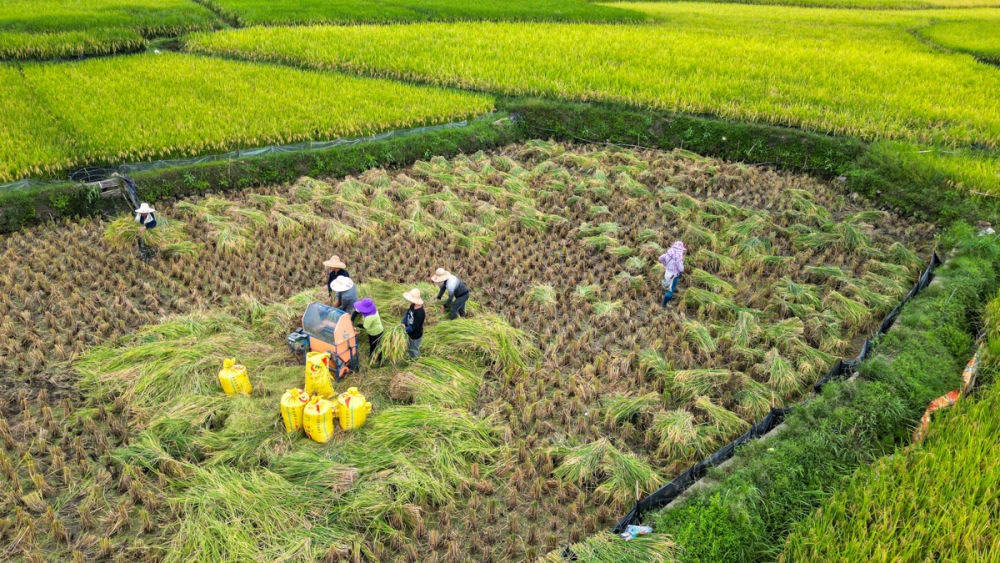 ↑2023年8月26日,湖南省郴州市桂陽(yáng)縣蓮塘鎮(zhèn)下馬村,農(nóng)民在收割稻谷。CICPHOTO/周秀魚春 攝