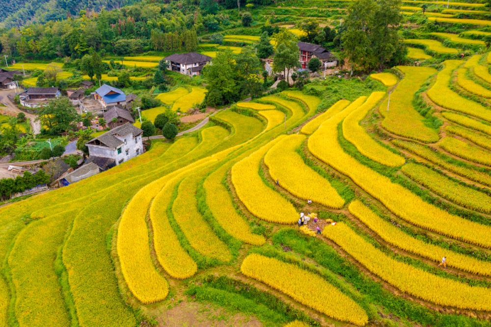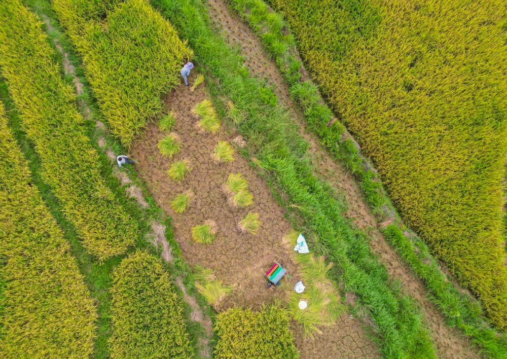 ↑2023年9月4日,湖南省東安縣舜皇山國(guó)家森林公園管理局塘家梯田,農(nóng)民在收割稻谷。CICPHOTO/嚴(yán)潔 攝