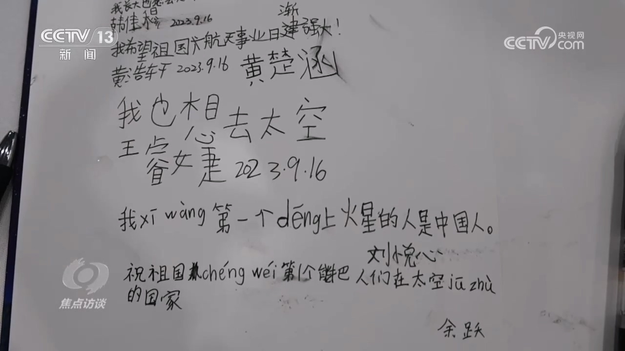 小學生肖品儀:“我們坐上艙下去有失去重心的感覺,挺驚險的,航天員勇敢上去,又安安全全返回來,確實挺勇敢的。”