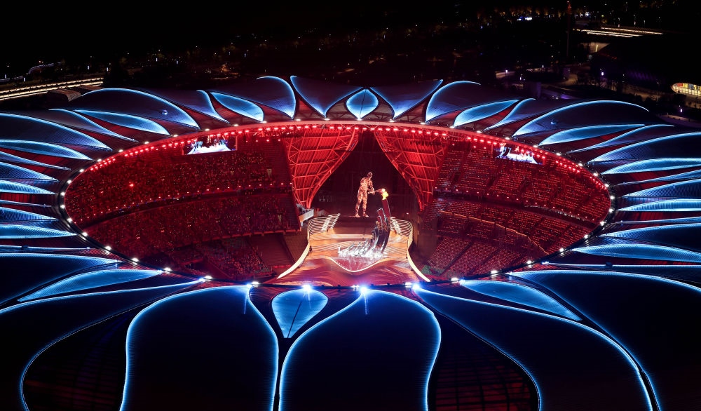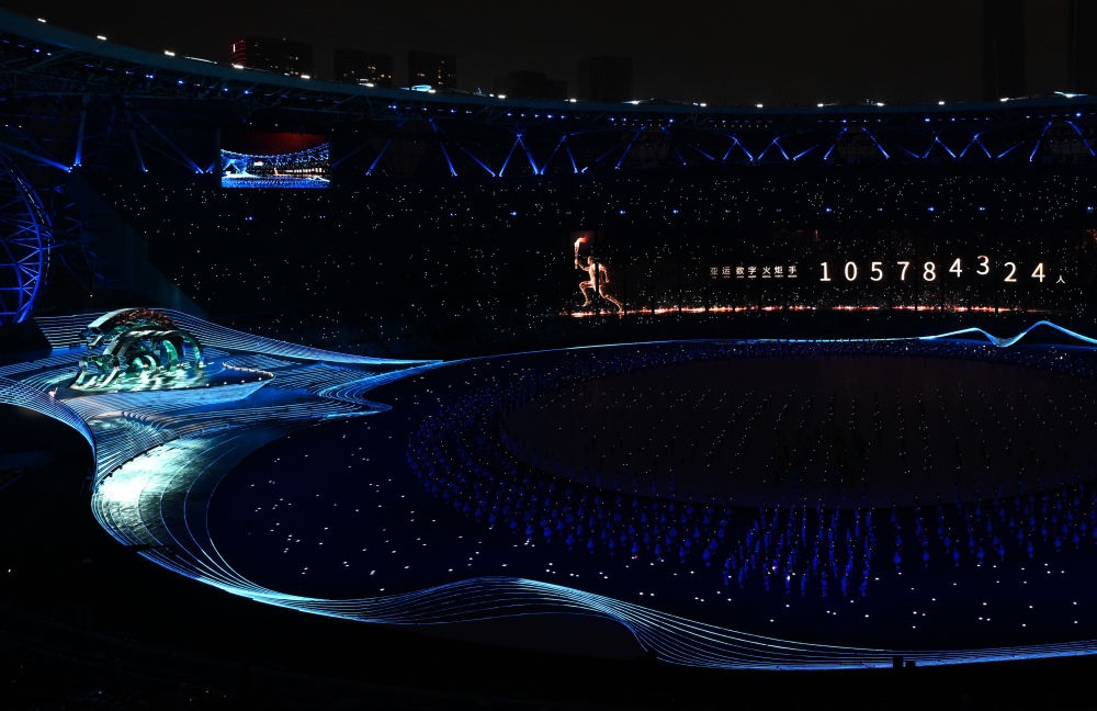 中國農(nóng)歷秋分節(jié)氣,杭州奧體中心體育場“大蓮花”燈光璀璨,萬涓成水,奔涌成潮?!皵?shù)字火炬手”與游泳運動員汪順共同點燃了象征亞洲大團結(jié)的體育之火,杭州第十九屆亞運會開幕。