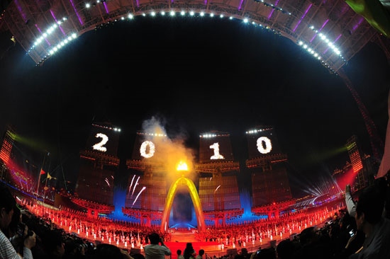 2010年11月12日,廣州,第十六屆亞運(yùn)會(huì)開幕式在海心沙島隆重舉行,圖為主火炬點(diǎn)火儀式。視覺中國(guó)供圖