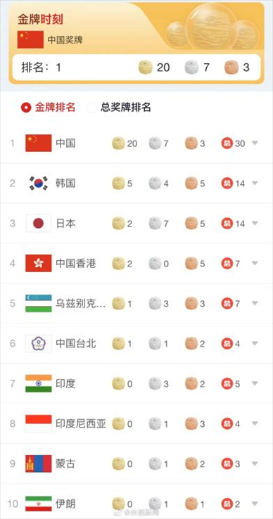 ·杭州亞運(yùn)會首日中國隊斬獲20金7銀3銅,位列獎牌榜第一名。