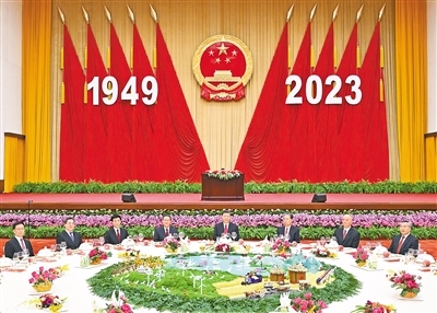 人民大會(huì)堂宴會(huì)廳華燈璀璨、鮮花綻放,洋溢著喜慶熱烈的節(jié)日氛圍。主席臺(tái)上方高懸著莊嚴(yán)的國(guó)徽,“1949—2023”大字年號(hào)在鮮艷的紅旗映襯下格外醒目。