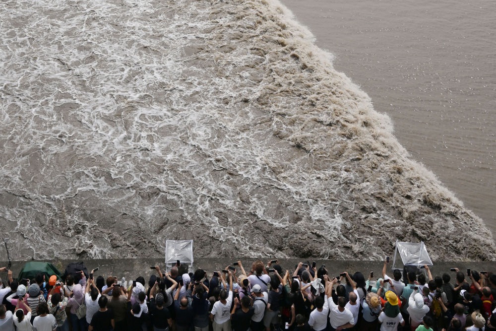 這是中秋當(dāng)日游客們?cè)谟^看錢塘江潮