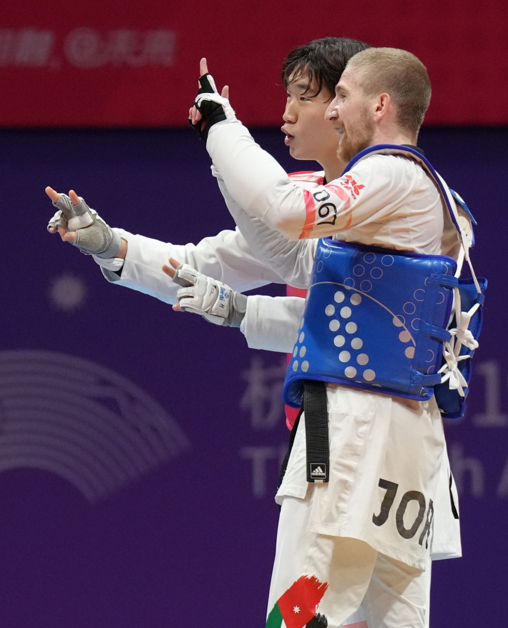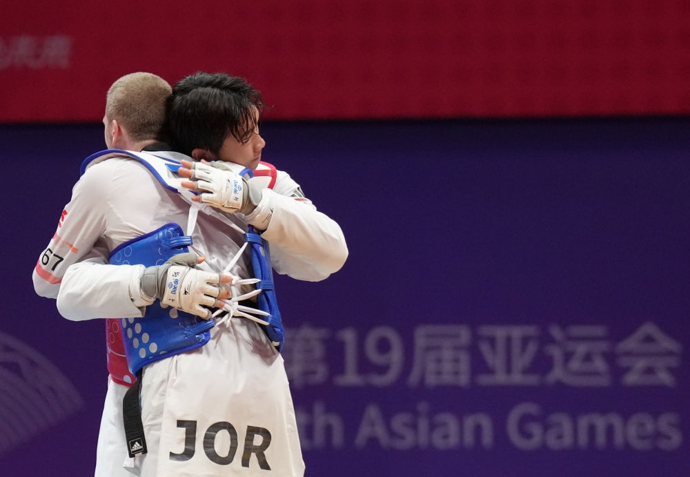 9月27日,韓國(guó)選手樸優(yōu)赫(右)在跆拳道男子80公斤級(jí)比賽后與約旦選手薩利赫·沙拉巴蒂一起向觀眾致意。