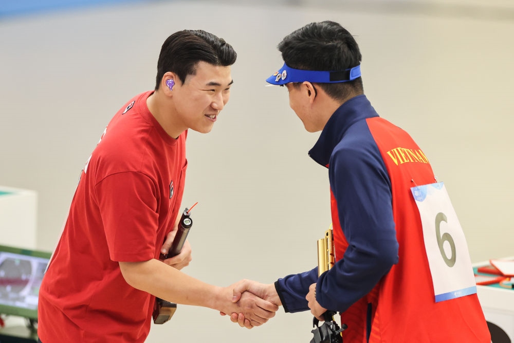 9月28日,韓國(guó)選手李元昊(左)與越南選手范光輝在男子10米氣手槍個(gè)人決賽后握手致意。??