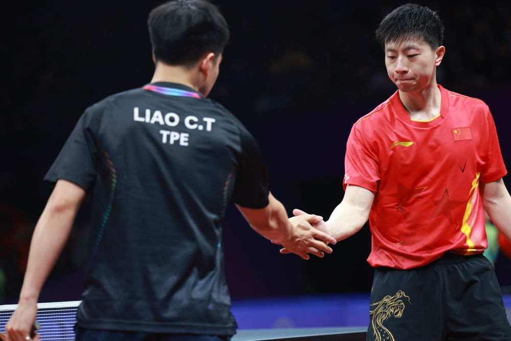 9月25日,中國(guó)隊(duì)選手馬龍(右)在乒乓球男子團(tuán)體半決賽后與中國(guó)臺(tái)北隊(duì)選手廖振珽握手致意。