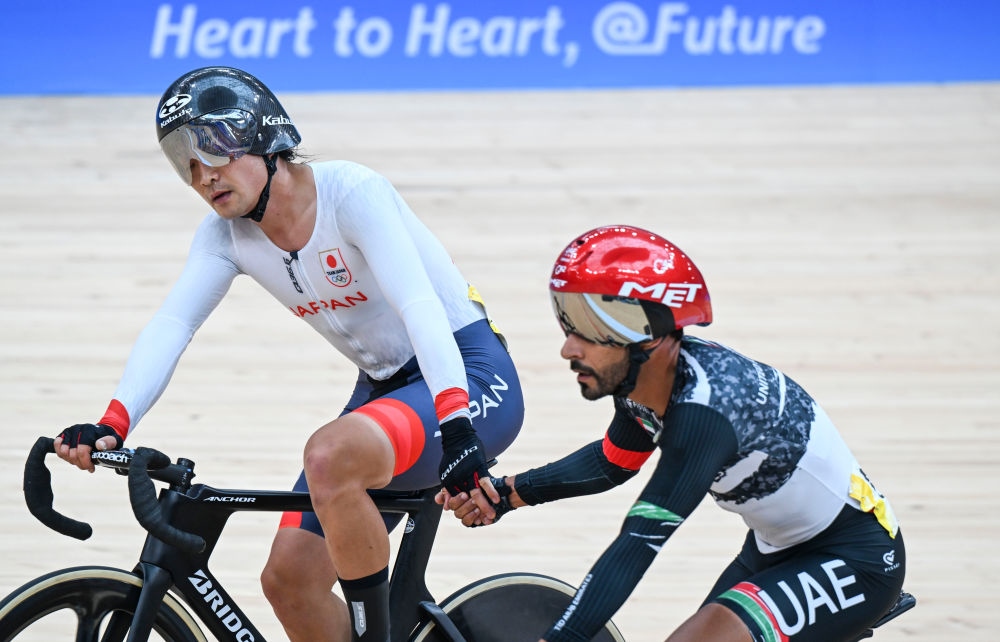 9月28日,日本選手窪木一茂(左)和阿聯(lián)酋選手艾哈邁德·曼蘇里在場(chǎng)地自行車男子全能賽沖刺賽后握手致意。
