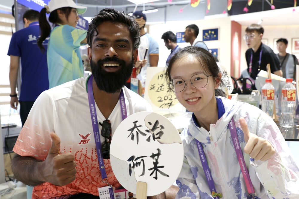 9月29日,馬爾代夫羽毛球運(yùn)動(dòng)員穆罕默德·阿杰凡·拉希德(左)在亞運(yùn)村樂活集市與工作人員合影留念。
