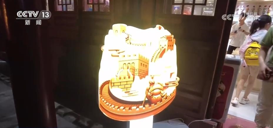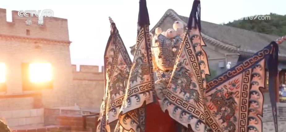 除了觀賞之外,八達嶺長城還為游客提供了豐富的消費體驗。在文化街區(qū)里,正在上演《夢回長城,八方來鶴》為主題的演出,游客們可以和京劇、地方歌舞的表演者互動。絢爛的燈光表演則為古老的長城增添了不少現(xiàn)代感與時尚感。穿上漢服,買一面國旗,品嘗一下長城的文創(chuàng)雪糕,市集小店里洋溢著濃濃的煙火氣。