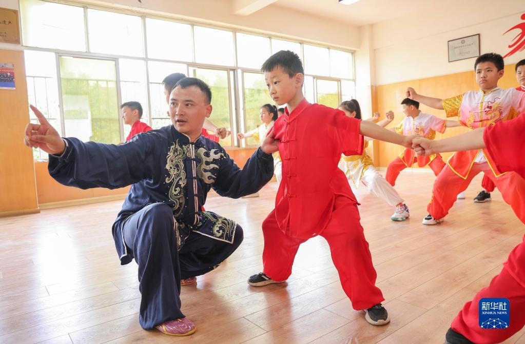 7月8日,在山東省臨沂市蘭山區(qū)一家武術(shù)館,武術(shù)老師指導學員練習拳法動作。