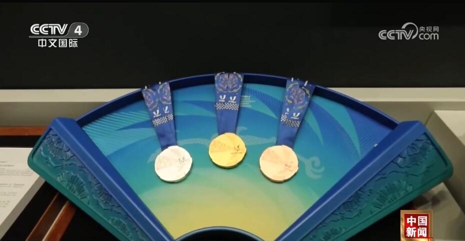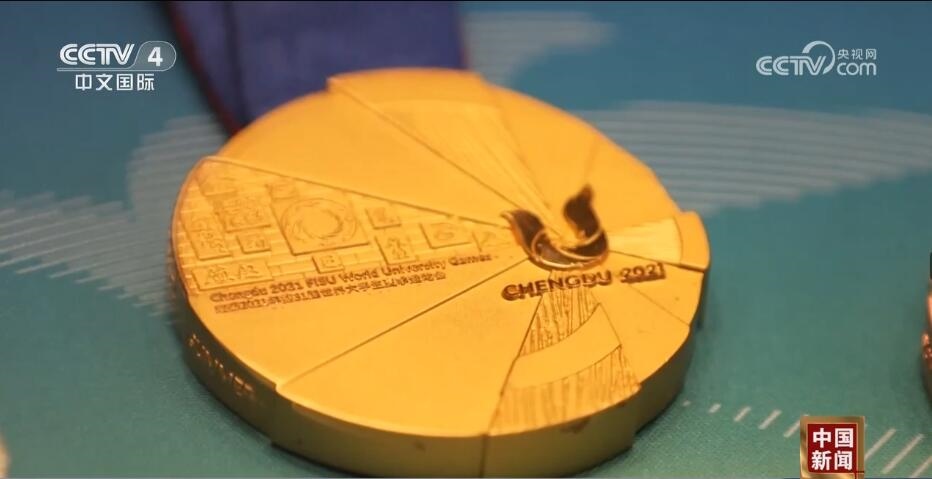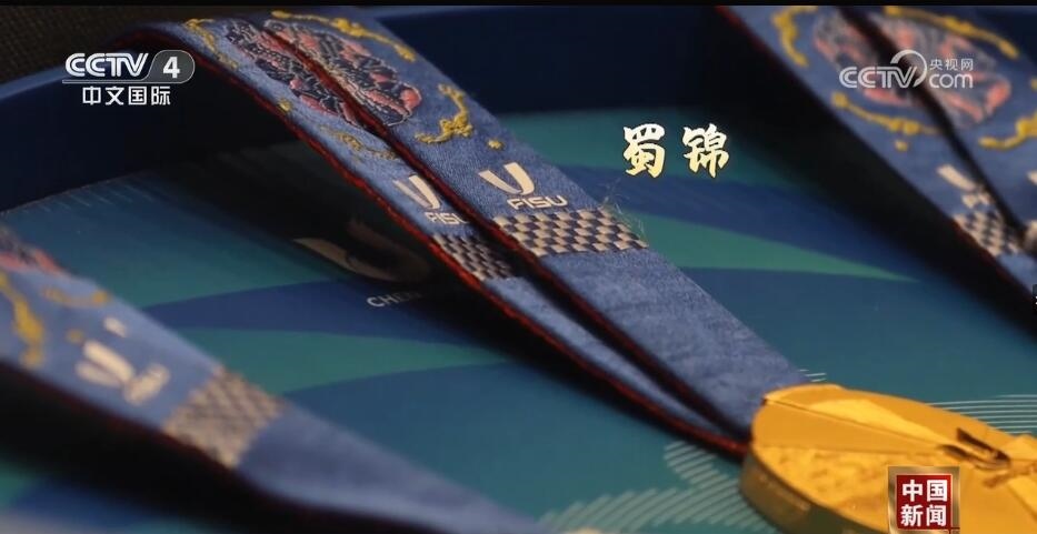 總臺(tái)記者 王豐:走進(jìn)成都大運(yùn)會(huì)博物館,最大的感受就是成都的元素?zé)o處不在。比如,我們剛一進(jìn)來,右手邊是成都大運(yùn)會(huì)的吉祥物蓉寶??赐耆貙殠鷣砜纯慈毓?,什么是蓉光呢?獎(jiǎng)牌代表了成都大運(yùn)會(huì)的榮譽(yù),“蓉”是取自成都的簡稱,包含了光榮和融合的含義,整個(gè)獎(jiǎng)牌的設(shè)計(jì)是呈現(xiàn)了不規(guī)則的圓形。另外,獎(jiǎng)牌的元素包含成都市的標(biāo)志——太陽神鳥。此外,在獎(jiǎng)牌的綬帶設(shè)計(jì)上首次采用了蜀錦的制作工藝,實(shí)際上也是非物質(zhì)文化遺產(chǎn)活化利用的非常好的案例。