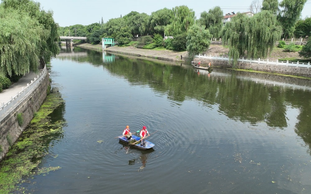 工作人員在湖州市吳興區(qū)埭溪鎮(zhèn)進(jìn)行河道保潔(6月21日攝,無(wú)人機(jī)照片)。新華社記者 翁忻旸 攝