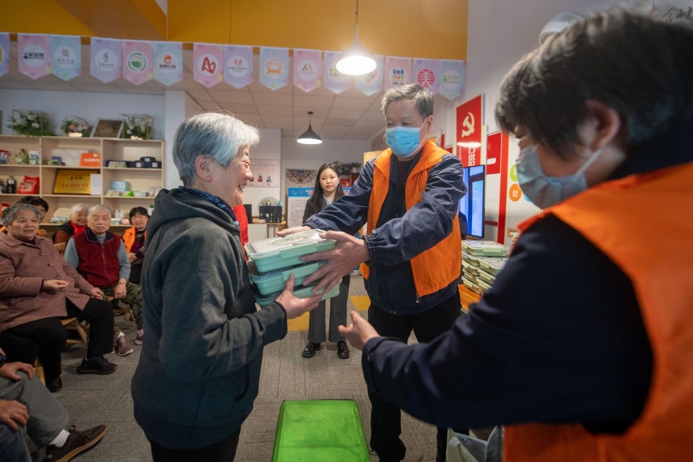 杭州市上城區(qū)南星街道白塔嶺社區(qū)志愿者在社區(qū)服務(wù)驛站為老人發(fā)放免費(fèi)愛(ài)心午餐(2022年11月23日攝)。新華社記者 江漢 攝