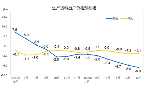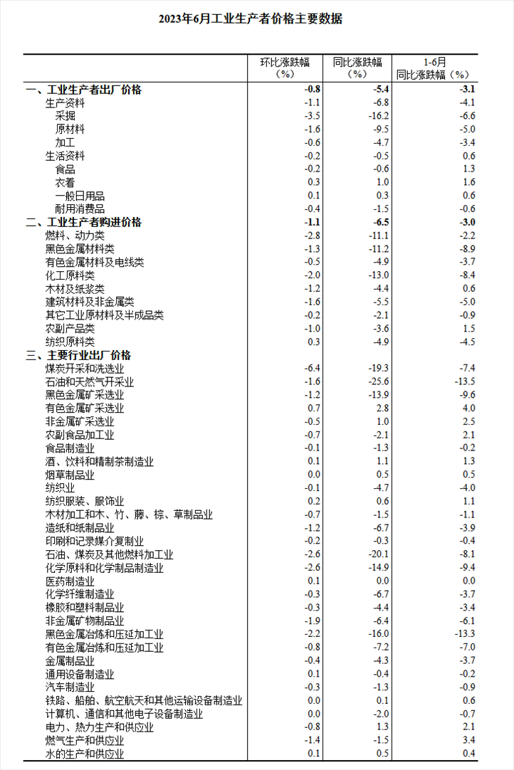 央視網(wǎng)消息:據(jù)國家統(tǒng)計(jì)局網(wǎng)站消息,2023年6月份,全國工業(yè)生產(chǎn)者出廠價(jià)格同比下降5.4%,環(huán)比下降0.8%;工業(yè)生產(chǎn)者購進(jìn)價(jià)格同比下降6.5%,環(huán)比下降1.1%。上半年,工業(yè)生產(chǎn)者出廠價(jià)格比上年同期下降3.1%,工業(yè)生產(chǎn)者購進(jìn)價(jià)格下降3.0%。