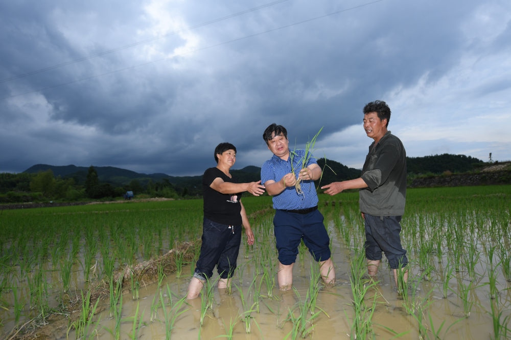 在浙江省仙居縣廣度鄉(xiāng)西角村,浙江大學(xué)環(huán)境與資源學(xué)院教授吳良?xì)g(中)在省級(jí)科研試驗(yàn)田里指導(dǎo)農(nóng)戶(hù)進(jìn)行水稻種植(7月4日攝)。新華社記者 翁忻旸 攝
