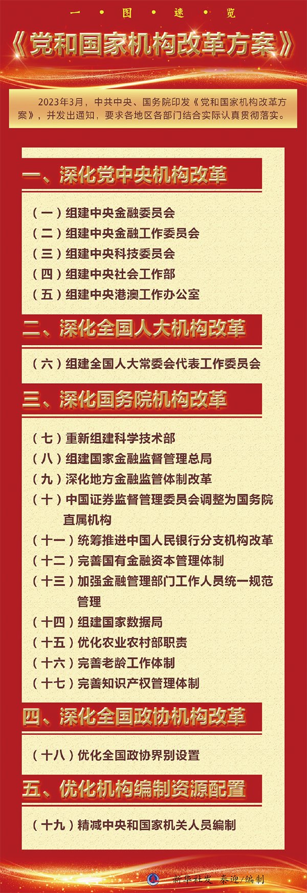 2023年3月10日上午9時(shí)許,北京人民大會(huì)堂大禮堂。2900多名全國人大代表按下表決器,十四屆全國人大一次會(huì)議表決通過了關(guān)于國務(wù)院機(jī)構(gòu)改革方案的決定,批準(zhǔn)了根據(jù)《黨和國家機(jī)構(gòu)改革方案》形成的國務(wù)院機(jī)構(gòu)改革方案。6天后,《黨和國家機(jī)構(gòu)改革方案》全文公開發(fā)布,向著強(qiáng)國建設(shè)、民族復(fù)興的宏偉目標(biāo),黨和國家機(jī)構(gòu)改革揚(yáng)帆破浪啟新程。