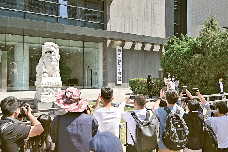 2023年5月18日,國家金融監(jiān)督管理總局正式掛牌,我國金融監(jiān)管機(jī)構(gòu)改革邁出重要一步。圖為當(dāng)日媒體記者在國家金融監(jiān)督管理總局門前拍攝。 新華社記者 李鑫/攝