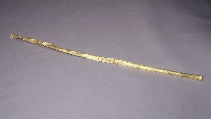 第三件是三星堆的金杖,它是古蜀國(guó)王權(quán)的象征。