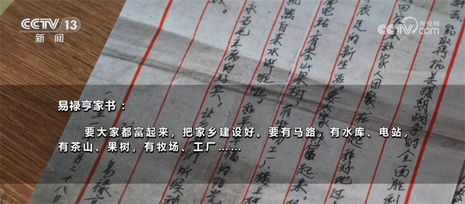 抱著與家人訣別的心情,年輕的易祿亨寫下了這封家書。除了戰(zhàn)場(chǎng)上的見(jiàn)聞和對(duì)家人的思念,他還寫下了對(duì)未來(lái)美好生活的憧憬:要大家都富起來(lái),把家鄉(xiāng)建設(shè)好。要有馬路,有水庫(kù)、電站,有茶山果樹(shù),有牧場(chǎng)、工廠……作為家中長(zhǎng)子,瞞著父母走上戰(zhàn)場(chǎng),易祿亨一直心懷愧疚。他希望通過(guò)這些文字,能讓父母理解自己的決定。