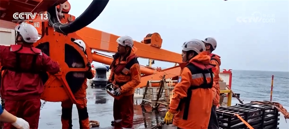 ?????? 而在艉甲板,科考隊員按次序站位,與科考甲板機械設備配合操作。