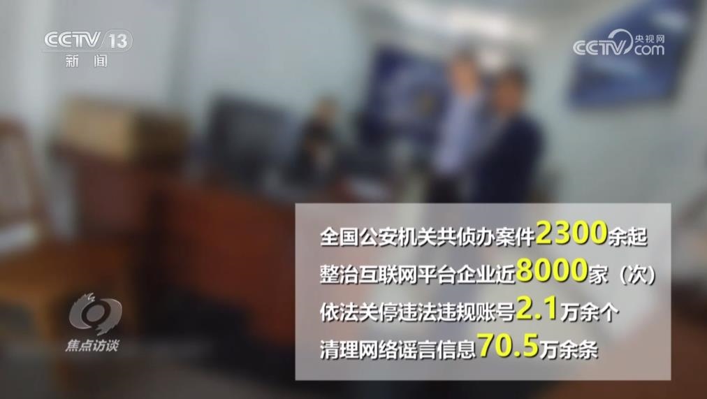 今年4月以來(lái),公安部網(wǎng)安局部署開(kāi)展為期100天的網(wǎng)絡(luò)謠言打擊整治專(zhuān)項(xiàng)行動(dòng),全國(guó)公安機(jī)關(guān)共偵辦案件2300余起,整治互聯(lián)網(wǎng)平臺(tái)企業(yè)近8000家(次),依法關(guān)停違法違規(guī)賬號(hào)2.1萬(wàn)余個(gè),清理網(wǎng)絡(luò)謠言信息70.5萬(wàn)余條,對(duì)網(wǎng)絡(luò)謠言違法犯罪形成強(qiáng)大震懾。