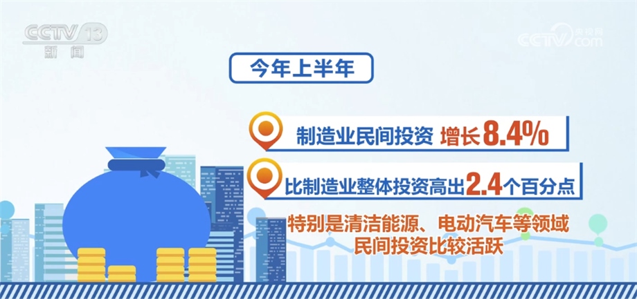 國家發(fā)展改革委相關(guān)負(fù)責(zé)人表示,當(dāng)前,民間投資結(jié)構(gòu)持續(xù)優(yōu)化,一些領(lǐng)域民間投資顯現(xiàn)了不少亮點(diǎn)。今年上半年,除房地產(chǎn)開發(fā)以外的民間投資同比增長(zhǎng)9.4%,增速比全部投資高5.6個(gè)百分點(diǎn);制造業(yè)民間投資增長(zhǎng)8.4%,比制造業(yè)整體投資高出2.4個(gè)百分點(diǎn),特別是清潔能源、電動(dòng)汽車等領(lǐng)域民間投資比較活躍;基礎(chǔ)設(shè)施民間投資增長(zhǎng)15.6%,比基礎(chǔ)設(shè)施整體投資高出8.4個(gè)百分點(diǎn),呈現(xiàn)出較強(qiáng)的投資信心和投資動(dòng)力。