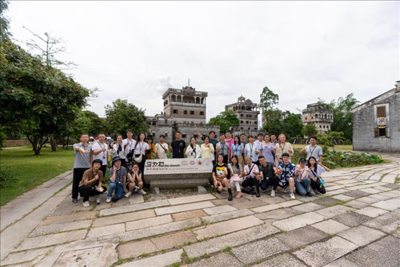 圖為采風(fēng)團(tuán)在世界文化遺產(chǎn)開平碉樓與村落留影。(主辦方供圖)