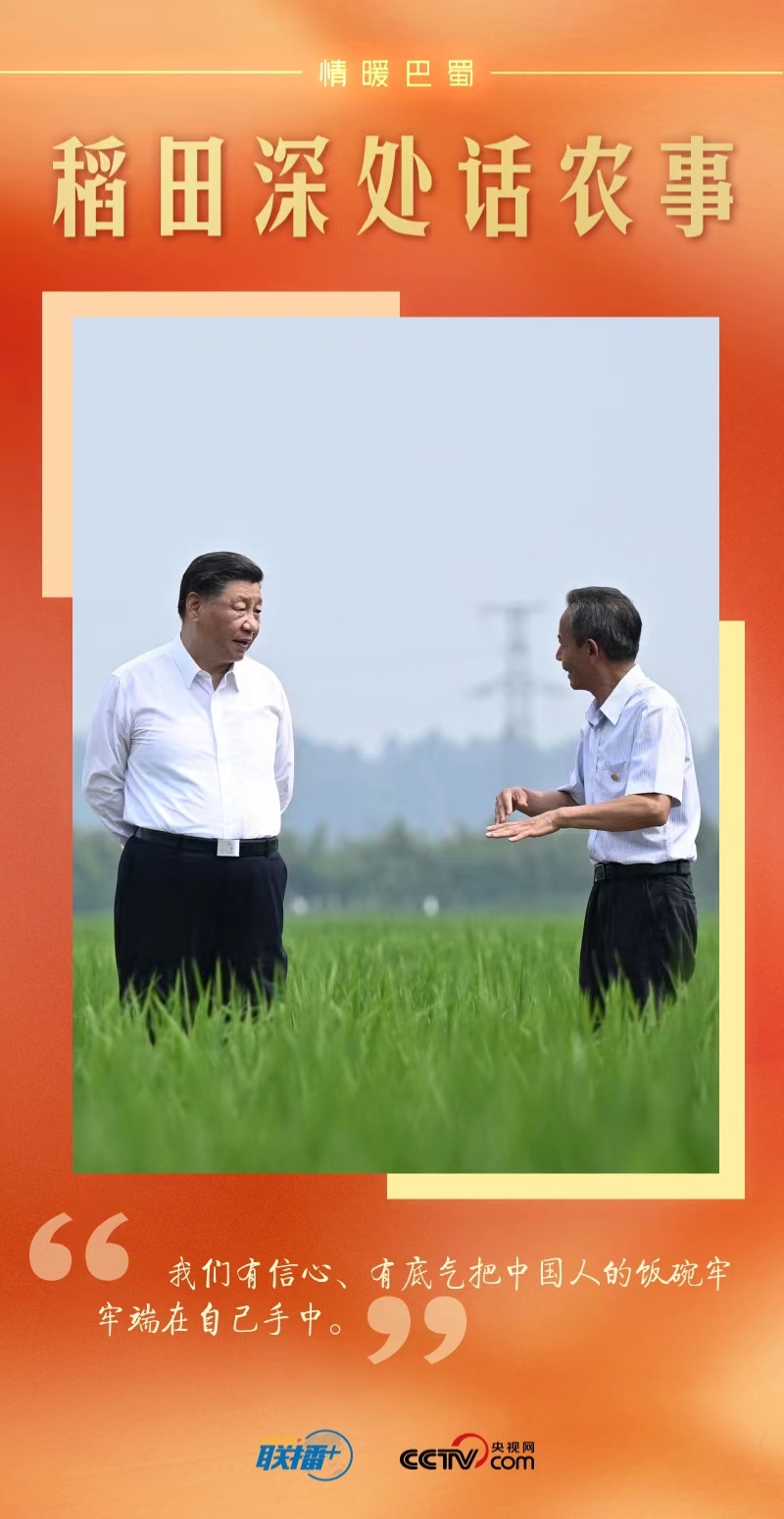 遠(yuǎn)眺廣袤田野,總書記思慮深遠(yuǎn):“民以食為天。推進(jìn)農(nóng)業(yè)現(xiàn)代化,既要靠我們中國的農(nóng)業(yè)專家,也要靠我們中國的農(nóng)民,我們有信心、有底氣實現(xiàn)糧食安全的目標(biāo)。四川要把農(nóng)業(yè)搞好,把糧食生產(chǎn)抓好?!?/p>
