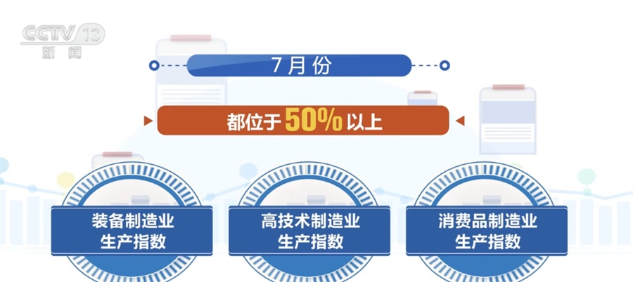 ?????? 國家統(tǒng)計局服務業(yè)調查中心二級巡視員 史朝暉:從具體的行業(yè)表現(xiàn)情況來看,7月份的石油煤炭加工、化學纖維及橡膠塑料制品,還有專用設備,鐵路、船舶、航空航天設備以及計算機通信電子設備,這些行業(yè)的生產指數(shù)和新訂單指數(shù)都是高于臨界點的,表明這些行業(yè)的產需兩端同步擴張。