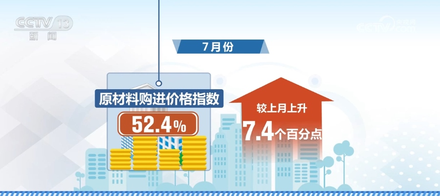 7月份,原材料購進價格指數(shù)為52.4%,較上月上升7.4個百分點,結束了連續(xù)三個月運行在50%以下的勢頭。制造業(yè)生產用原材料價格總體水平有所上升。