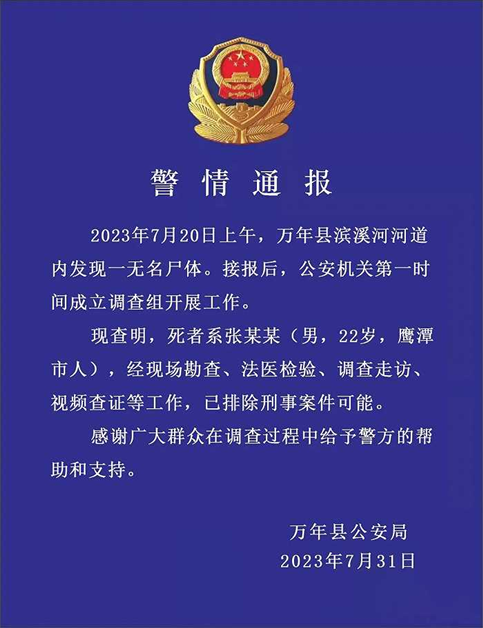 ·江西萬(wàn)年警方再通報(bào)“河道發(fā)現(xiàn)無(wú)名尸體”:已排除刑事案件可能。