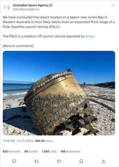 ·外媒:澳大利亞海灘不明物體被確認為印度火箭碎片。