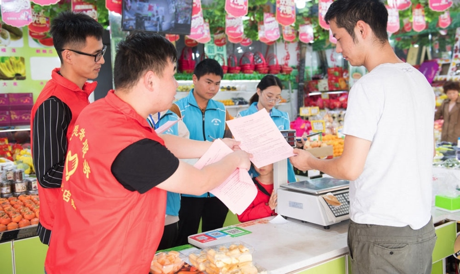 浙江省湖州市吳興區(qū)八里店鎮(zhèn)結(jié)合主題教育和“三服務(wù)”,推進(jìn)“民生大走訪”工作機(jī)制,全體網(wǎng)格員下沉村、社一線,了解社情民意,化解矛盾糾紛,服務(wù)村社群眾。這是八里店鎮(zhèn)中心片區(qū)網(wǎng)格員(藍(lán)衣者)和志愿者(紅衣者)對(duì)一家店鋪進(jìn)行平安問(wèn)卷調(diào)查(2019年10月31日攝)。新華社記者 翁忻旸 攝