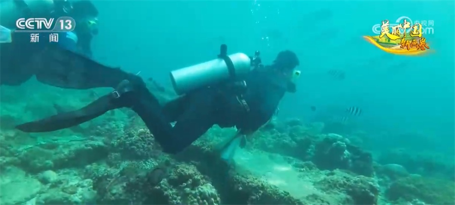 總臺央視記者 焦?。?/strong>我現(xiàn)在位于海南三亞蜈支洲島,在我身旁的這片海域就是我國的第一個熱帶海洋牧場。這段時間,海洋牧場正在進行珊瑚移植和調裝魚礁的工作。我們帶著水下攝像機,跟隨著工作人員一起進入海底,體驗在海里如何“植樹造林”。