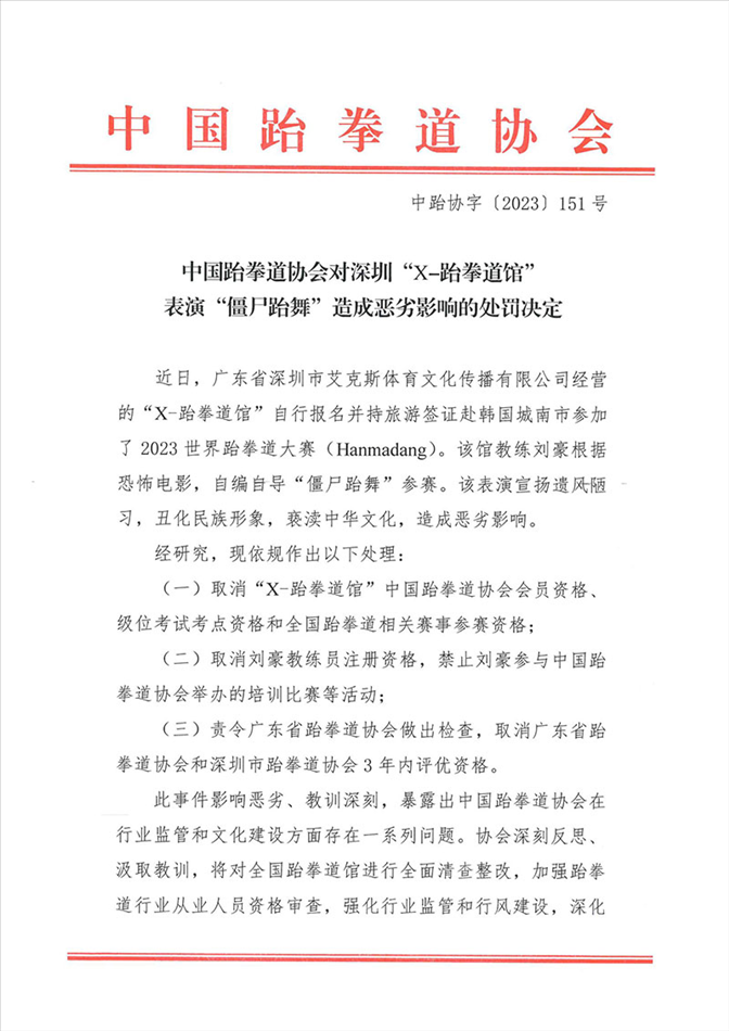 ·在韓表演“僵尸跆舞”跆拳道館被中國(guó)跆拳道協(xié)會(huì)處罰:取消會(huì)員和賽事參賽資格。