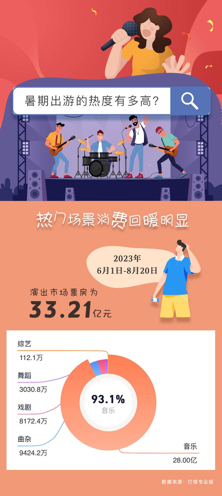 作為演出市場的傳統(tǒng)旺季,暑假期間演唱會、Live house、戲劇、音樂劇等各類熱門演出“一票難求”。根據(jù)燈塔專業(yè)版最新數(shù)據(jù),暑期檔中的6月1日至8月23日演出市場票房已經超過30億元,而相當可觀的跨城觀演比例,更引得除了演出票房之外的周邊產業(yè)一起火?!耙粋€演出圈粉一座城”,當?shù)芈糜谓洕粩嘤楷F(xiàn)新的可能。
