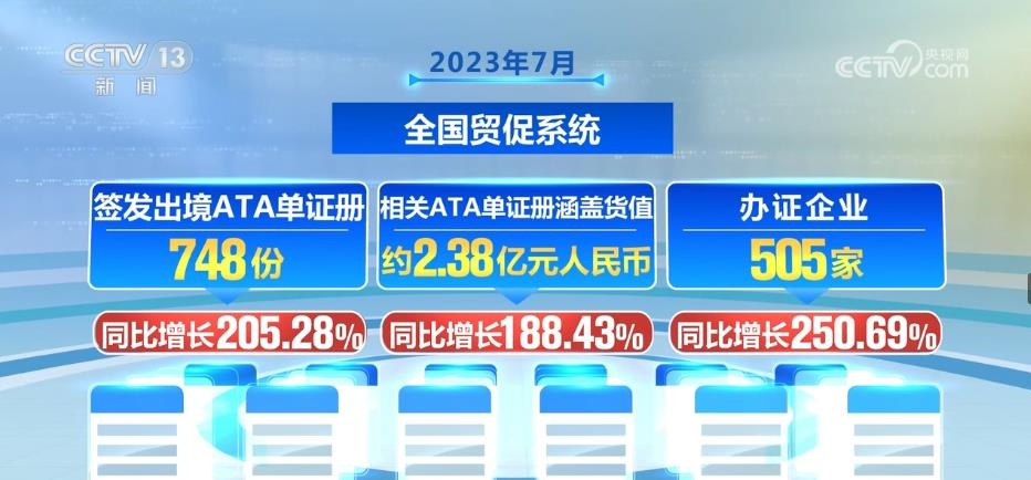 2023年7月,全國貿(mào)促系統(tǒng)共簽發(fā)出境ATA單證冊(cè)748份,同比增長(zhǎng)205.28%;相關(guān)ATA單證冊(cè)涵蓋貨值約2.38億元人民幣,同比增長(zhǎng)188.43%;辦證企業(yè)505家,同比增長(zhǎng)250.69%。