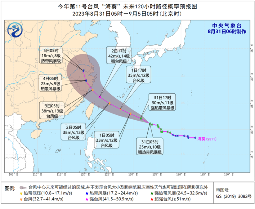 預(yù)計,“蘇拉”將以每小時10公里左右的速度向西北方向移動,逐漸向廣東東部一帶沿??拷?,強(qiáng)度緩慢減弱,并將于9月1日下午至夜間在廣東惠來到香港一帶沿海登陸(強(qiáng)臺風(fēng)級或超強(qiáng)臺風(fēng)級,45~52米/秒,14~16級),也有可能在廣東東部近岸海面向西偏南方向移動。中央氣象臺今晨升級發(fā)布臺風(fēng)紅色預(yù)警。