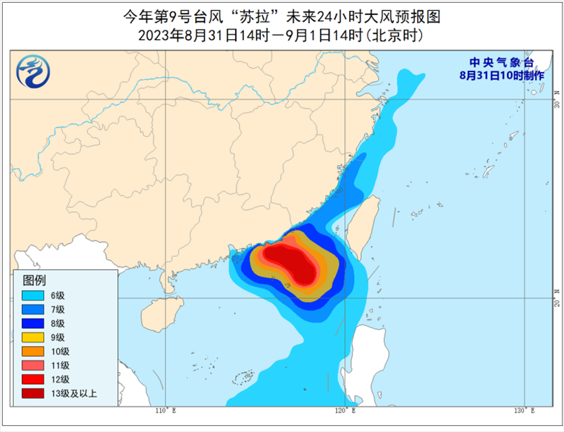 大風預報:8月31日14時至9月1日14時,巴士海峽、臺灣海峽、南海東部和南部、福建沿海、廣東中東部沿海、臺灣島南部沿海、東沙群島將有6-8級、陣風9-10級的大風,其中南海東北部、東沙群島的風力有9-11級,部分海域風力可達12-13級,“蘇拉”中心經(jīng)過的附近海面風力有14-17級、陣風17級以上。