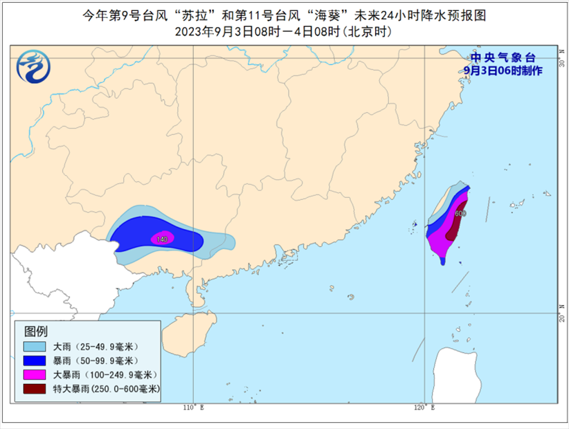 降水預報:9月3日08時至4日08時,受“蘇拉”和“海葵”影響,廣西中南部、廣東西南部、臺灣島等地部分地區(qū)有大到暴雨,其中,廣西中南部、臺灣島中東部等地部分地區(qū)有大暴雨,臺灣島東部部分地區(qū)有特大暴雨(250-600毫米)。