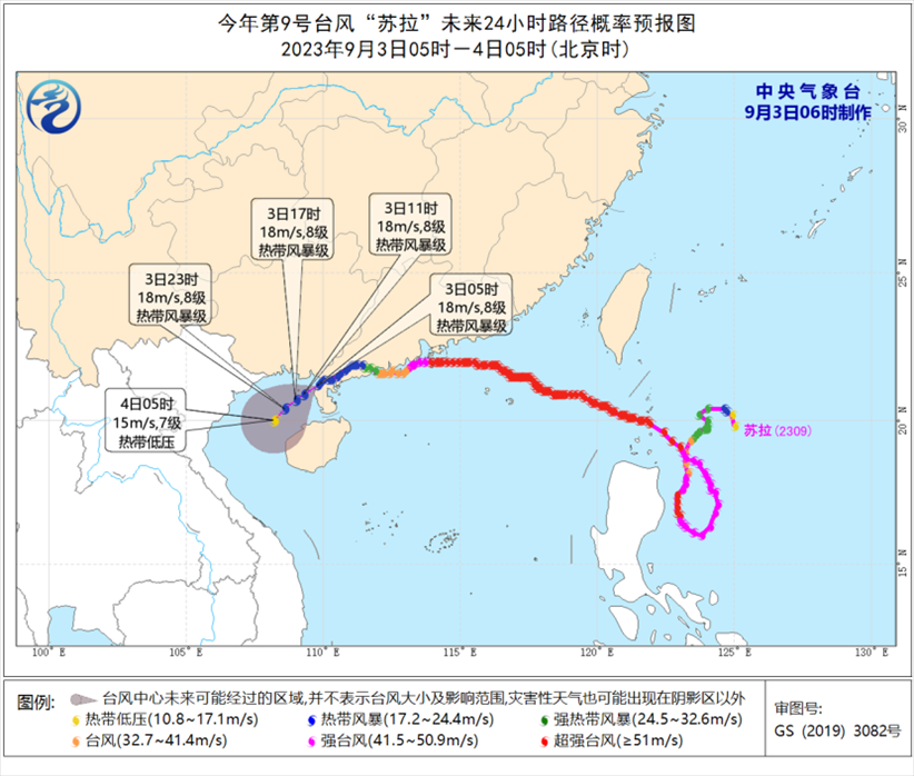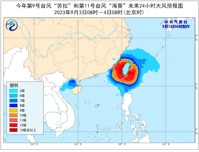 大風預報:9月3日08時至4日08時,受“蘇拉”影響,北部灣、瓊州海峽以及廣西南部沿海、海南島北部沿海等地將有6-7級大風,其中北部灣部分海域?qū)⒂?級、陣風9-10級的大風;受“海葵”影響,巴士海峽、臺灣海峽、臺灣以東洋面、東海南部及釣魚島附近海域以及浙江南部沿海、福建沿海、臺灣島沿海將有6-8級、陣風9-10級大風,部分海域或地區(qū)的風力有9-12級,陣風13-14級,“海葵”中心經(jīng)過的附近海面或地區(qū)的風力有13-16級,陣風17級。
