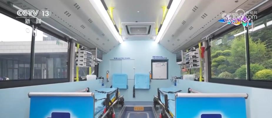 大型5G移動(dòng)急救復(fù)蘇單元由兩輛公交車改裝而成,包含1輛急救治療車和1輛急救指揮車。急救治療車內(nèi)設(shè)有2個(gè)擔(dān)架位和1個(gè)搶救床位,可同時(shí)轉(zhuǎn)運(yùn)多名危重病人。車內(nèi)配備了功能全面、集成度高的急救和轉(zhuǎn)運(yùn)平臺(tái),可以在車內(nèi)開展體外呼吸循環(huán)支持和緊急救命性手術(shù)等復(fù)雜急救手段。