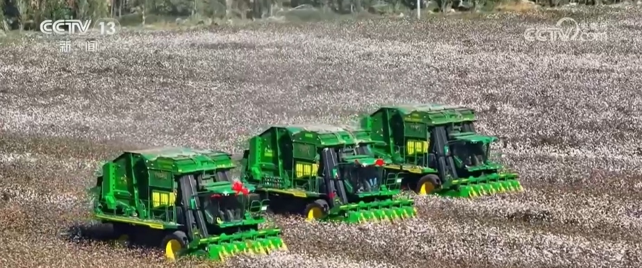 2023年,當(dāng)?shù)孛藁ǚN植面積74萬(wàn)畝。在瑪納斯縣涼州戶鎮(zhèn)呂家莊村的萬(wàn)畝棉田里,3臺(tái)新引進(jìn)的棉花采收打包一體機(jī)正在采收棉花。采棉機(jī)能夠高效快速地將棉花從棉稈上脫離,采凈率高達(dá)95%以上。一臺(tái)采棉機(jī)平均每天可采收700多畝棉花,相當(dāng)于1000名拾花工勞動(dòng)量的總和。