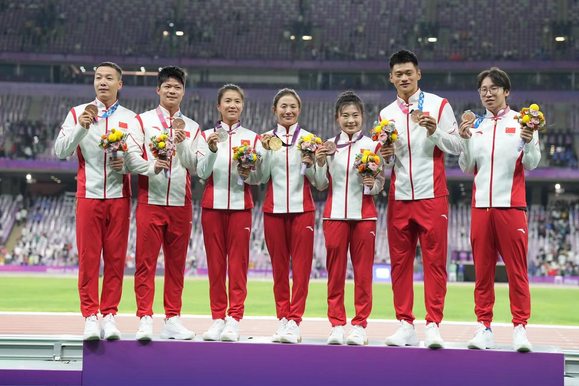 10月4日晚,在杭州亞運(yùn)會田徑比賽全部結(jié)束后,中國奧委會為蘇炳添、謝震業(yè)、吳智強(qiáng)、湯星強(qiáng)、切陽什姐、劉虹和呂秀芝補(bǔ)發(fā)了奧運(yùn)會獎(jiǎng)牌。