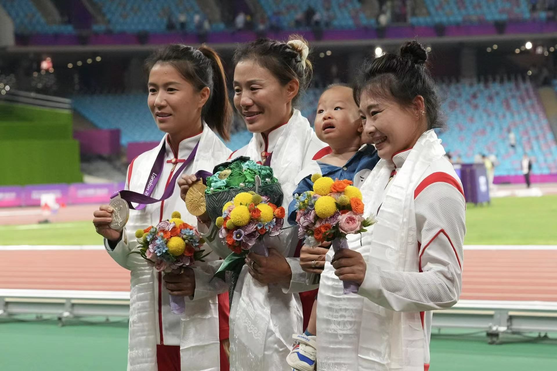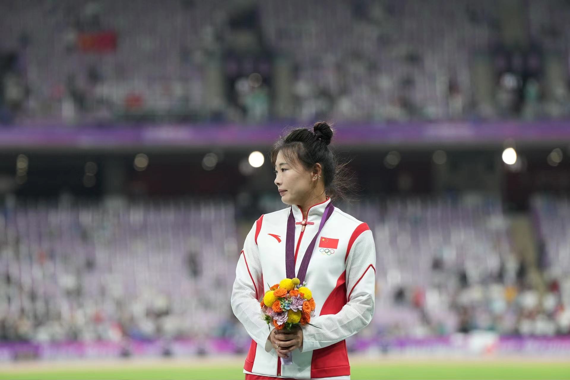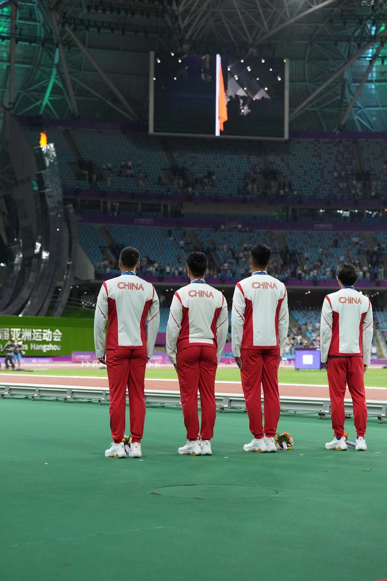 補(bǔ)發(fā)現(xiàn)場,首先頒發(fā)的是男子4×100米接力銅牌。四位中國小伙子笑著走上銅牌領(lǐng)獎(jiǎng)臺,接受頒獎(jiǎng)。隨后的競走頒獎(jiǎng)儀式上,在三位得獎(jiǎng)運(yùn)動員獲頒獎(jiǎng)牌后,《義勇軍進(jìn)行曲》奏響,三面五星紅旗冉冉升起,切陽什姐眼中涌動著晶瑩的淚花。
